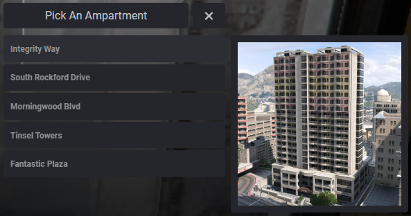 SickApartmentSelect is a super simple script that works with PS-Housing and Multichar scripts that bypass PS-Housing starter apartment section. This will allow your players to still claim ONE free apartment in the city!